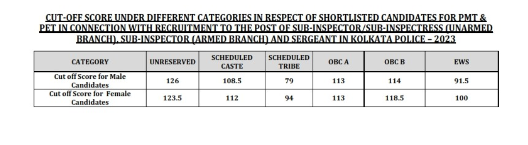 Result of Preliminary Written Examination for the post of Sub-Inspector/ Sub-Inspectress (Unarmed Branch), Sub-Inspector (Armed Branch) and Sergeant in Kolkata Police - 2023